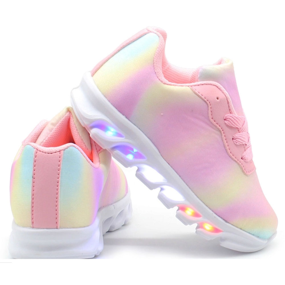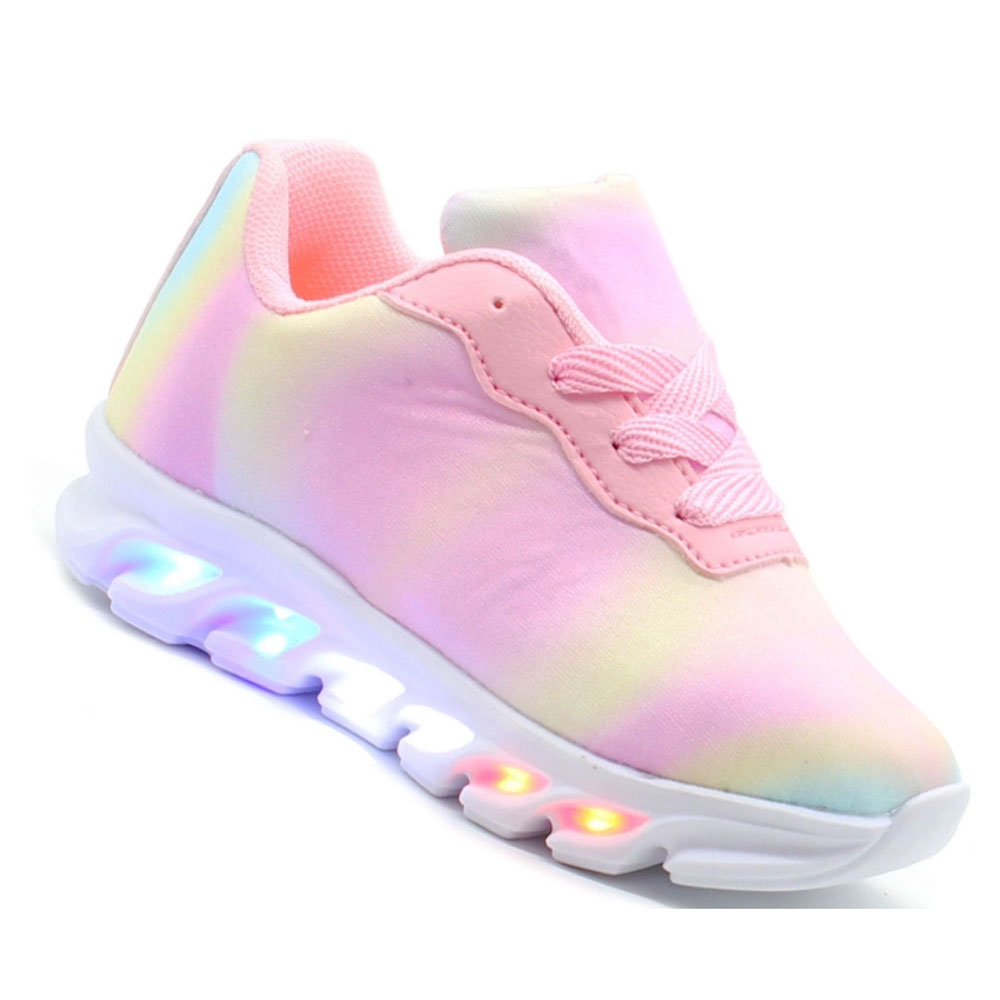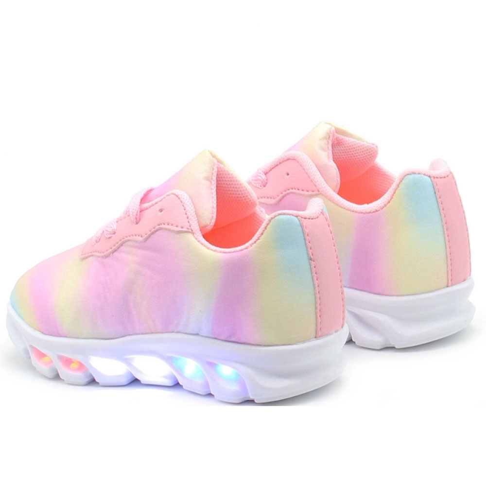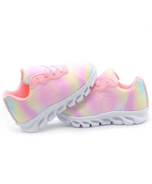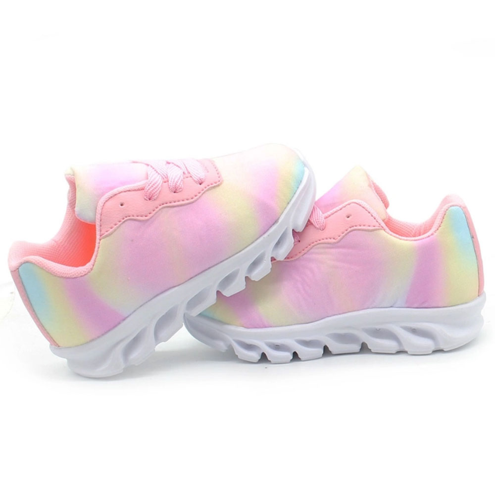 DescriçãoTenis infantil feminino com luzes coloridas Arco Iris. Inspirado na tendência Tie Dye o tenis com luz de led arco iris veio para agradar pais e filhos, confeccionado em tecido flexível e leve, garante o conforto e maciez que os pesinhos exigem já sua luzes fortes fazem diversão das criança o dia inteiro, modelo fácil de calçar,Fechamento por cadarços. Leds: Duração média de 5 mil pisadas, sem manutenção.